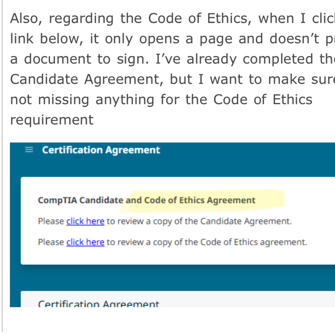 그리고 여기서 끝이 아니고 -_. CompTIA 계정에 들어가서 Candidate Agreement 와 Code of Ethics에 서명도 해줘야 최종 갱신이 마무리된다. 이걸 모르고 CEU랑 결제만 했다가 갱신이 안 됐다고 당황하는 경우가 있다고 하니 참고. 한가지 더 유의할 점은, code of ethics 은 실제로 사인하는 블락은 없고 링크 누르고 페이지 뜨면 대강 훑고만 넘어가면 된다는 점.